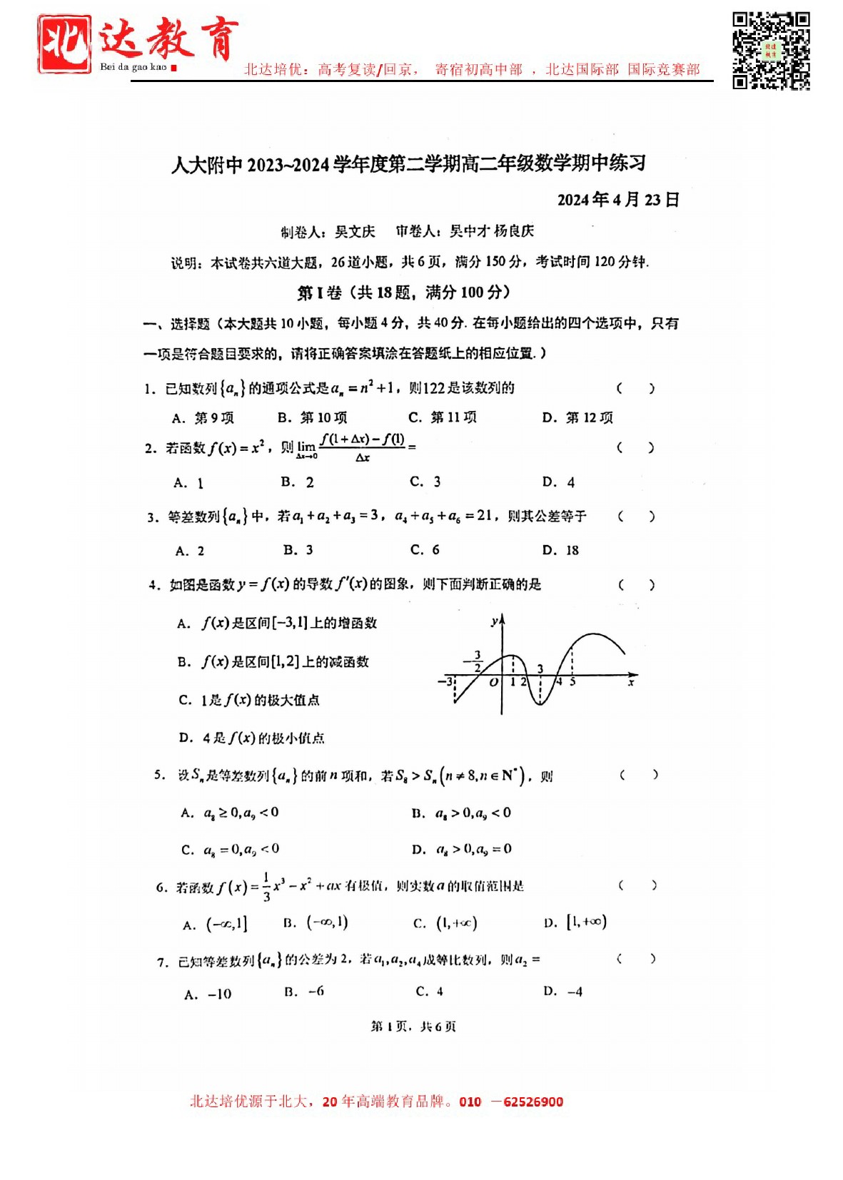 2024年北京人大附中高二(下)期中开考,北达教育整理了2024北京人大附中高二(下)期中数学试卷含答案,分享给同学们。