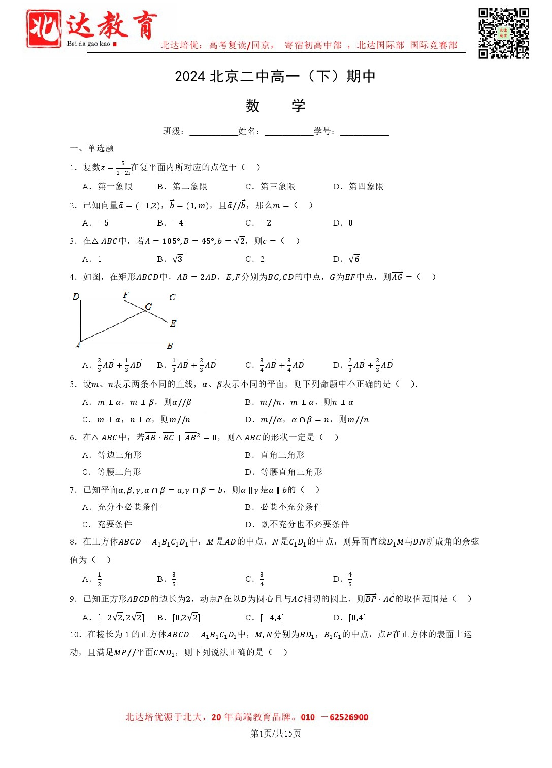 2024年北京二中高一(下)期中开考,北达教研组整理了2024北京二中高一(下)期中数学试卷含答案,分享给同学们。 导读推荐:2024北京各区高一(下)期中试题及答案汇总 北京北达全日制学校:中高考复读,外地…
