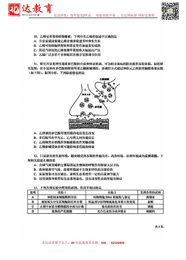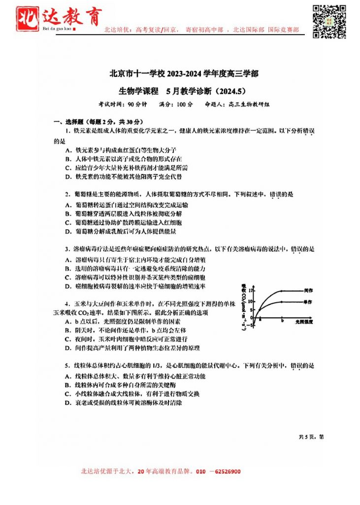 2024年北京各区高三三模陆续进行中,北达教研组收集并整理了2024北京十一学校高三三模生物试卷含答案,分享给同学们。