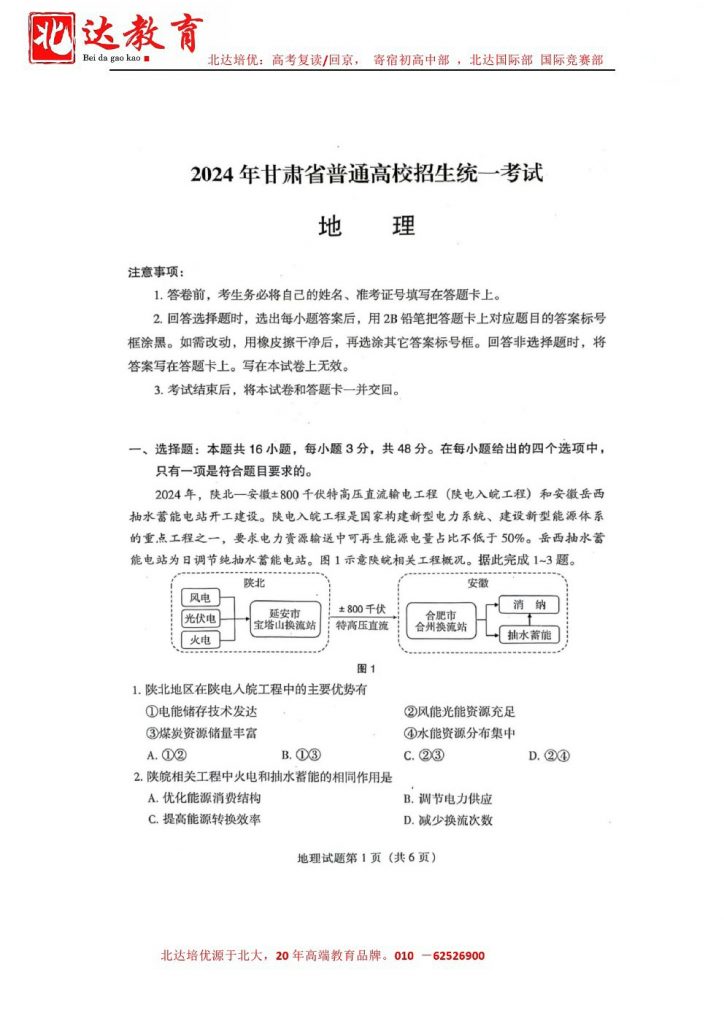 2024高考考试已结束,为了方便同学们查找高考试题及答案,我们特意整理了2024甘肃高考地理试题及答案,分享给同学们。详情如下: 北京北达全日制学校:中高考复读,外地回京,艺考生文化课★咨询电话:400-616…