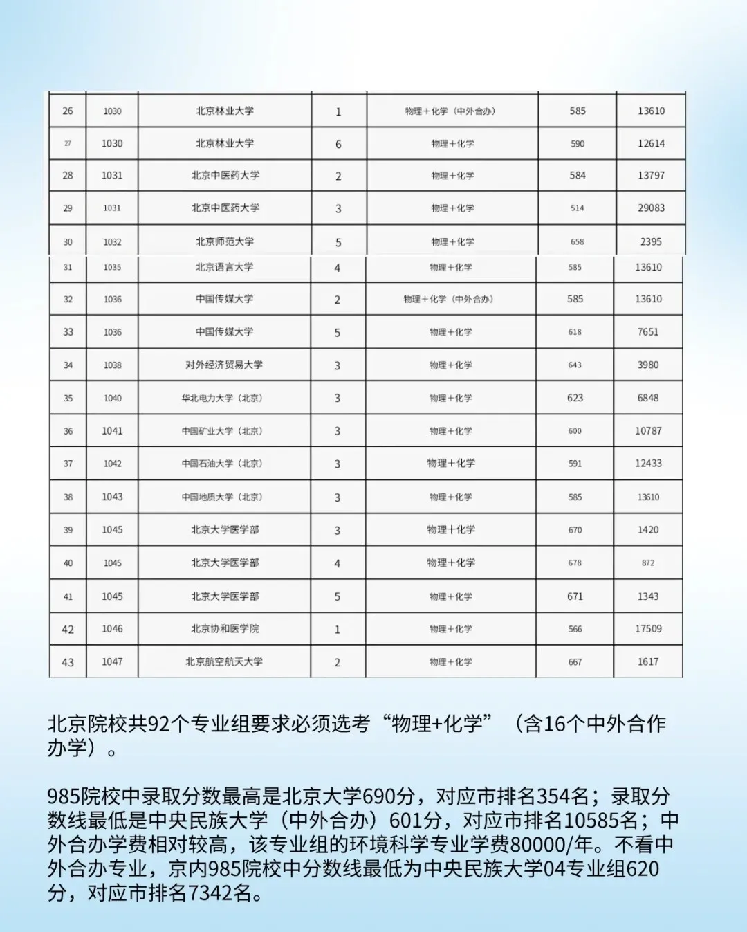 今年各高校在京招生专业组共计1258个,其中选考科目“物理+化学”必须选考专业组568个,小编整理了2024北京高考本科普通批次京内院校物化选科专业组在京录取最低分及对应市排名,一起来看吧~