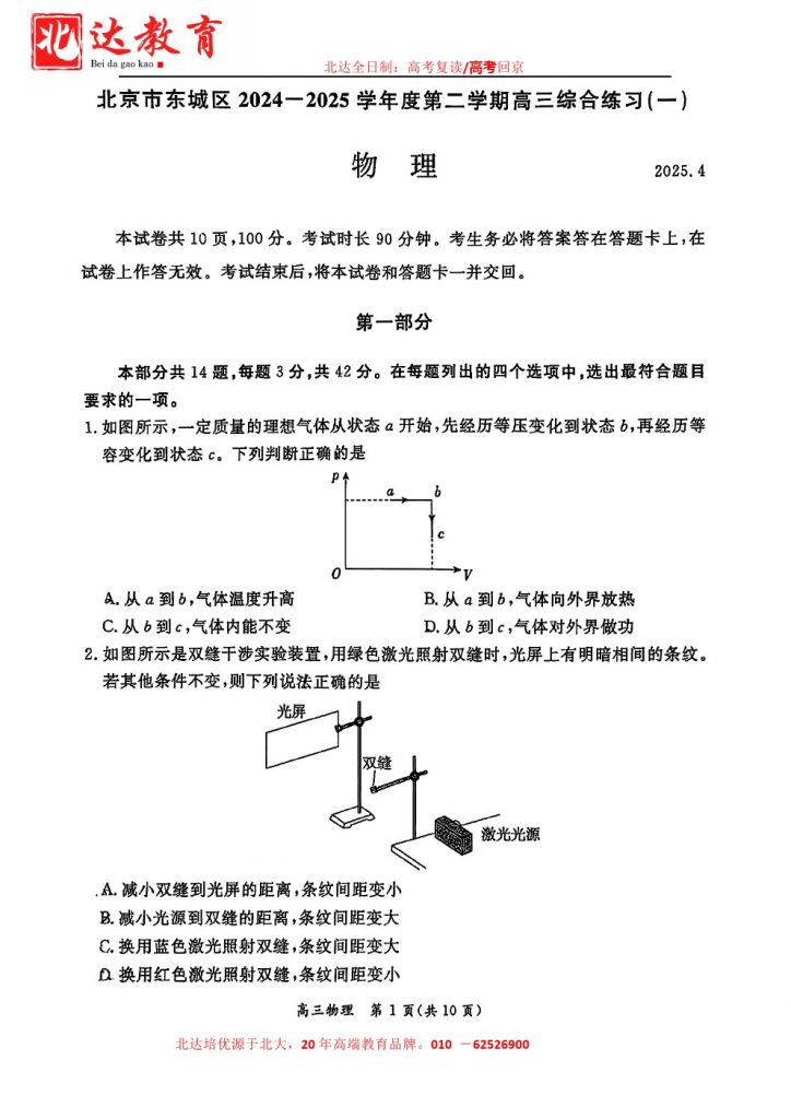 北京2025高三一模正在陆续进行中,为方便大家对答案、下载练习等小编给大家搜集了北京东城2025高三一模物理试题及答案解析,需要的小伙伴赶紧下载练习起来吧: