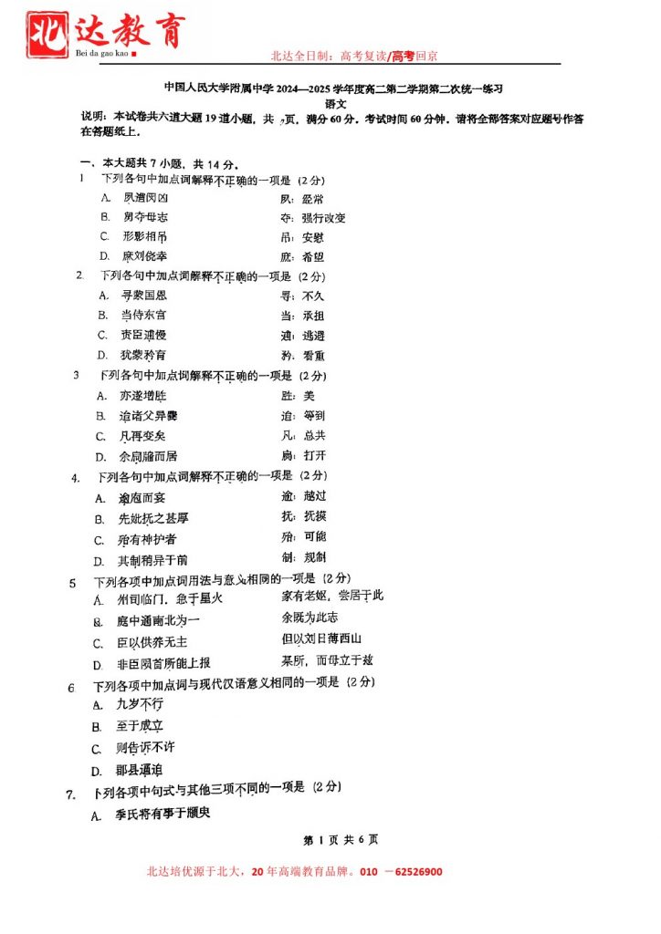 为方便大家对答案、下载练习等小编给大家搜集了人大附中2025高二(下)统练二语文试题及答案,需要的小伙伴赶紧下载练习起来吧: