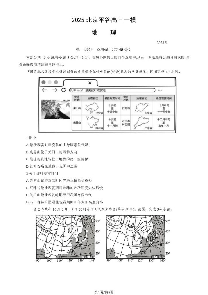 北京2025高三一模正在陆续进行中,为方便大家对答案、下载练习等小编给大家搜集了2025北京平谷区高三一模地理试题及答案,需要的小伙伴赶紧下载练习起来吧: