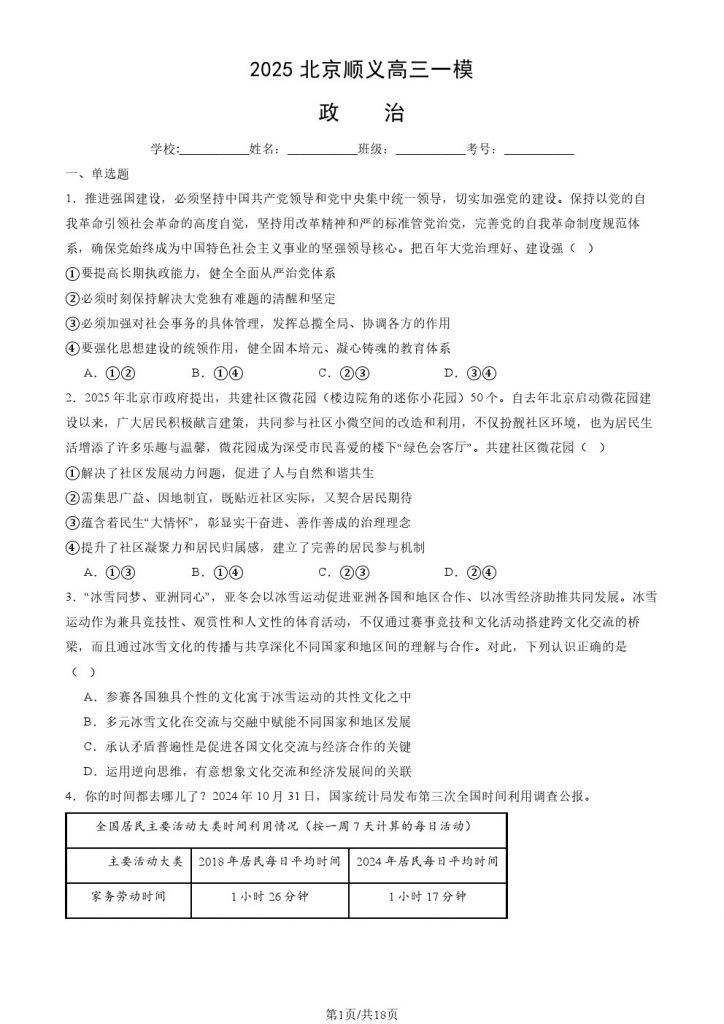 北京2025高三一模正在陆续进行中,为方便大家对答案、下载练习等小编给大家搜集了2025北京顺义区高三一模政治试题及答案,需要的小伙伴赶紧下载练习起来吧: