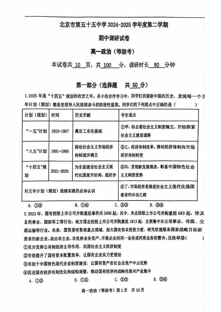 2025北京各区高一期中考已陆续开始,北达教研组整理了2025北京五十五中高一(下)期中政治(等级考)试题,分享给大家。 2025北达高考复读全日制,应届生全日制,外地回京全日制采…