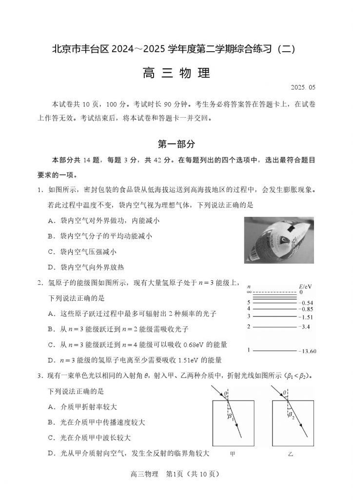 北京2025高三二模正在陆续进行中,为方便大家对答案、下载练习等,小编给大家搜集了2025丰台高三二模物理试题,需要的小伙伴赶紧下载练习起来吧: