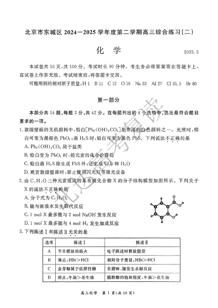 北京2025高三二模正在陆续进行中,为方便大家对答案、下载练习等,小编给大家搜集了北京东城2025高三二模化学试题及答案,需要的小伙伴赶紧下载练习起来吧: