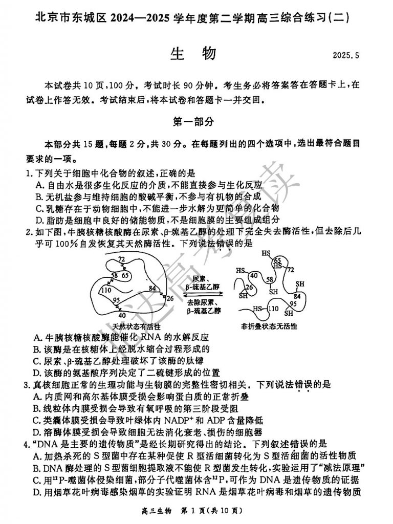 北京2025高三二模正在陆续进行中,为方便大家对答案、下载练习等,小编给大家搜集了北京东城2025高三二模生物试题及答案,需要的小伙伴赶紧下载练习起来吧: