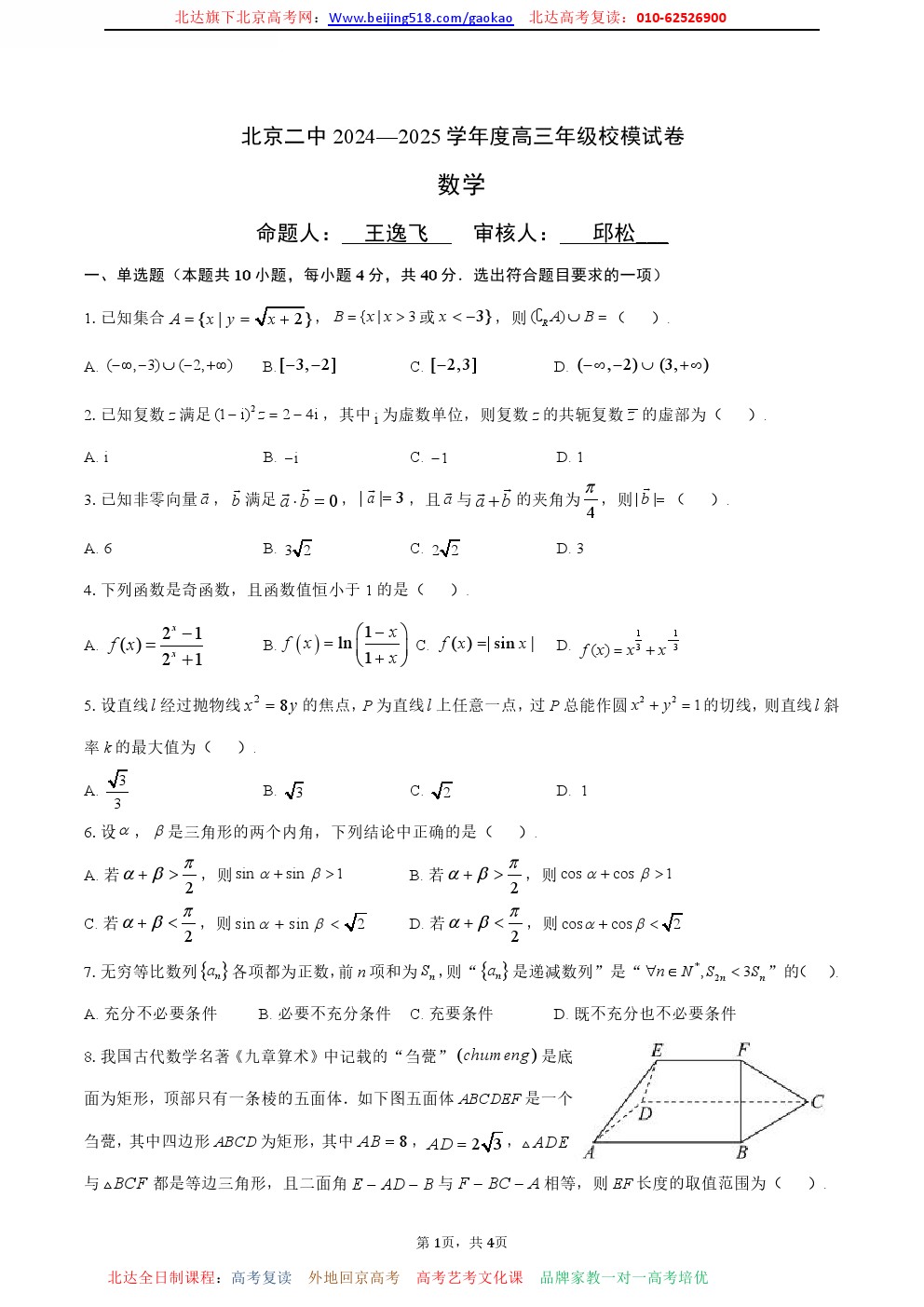 北京部分中学近期陆续进行了高三三模考试,北达高考复读学校整理了2025北京二中高三三模数学试题及答案,供考生下载练习。