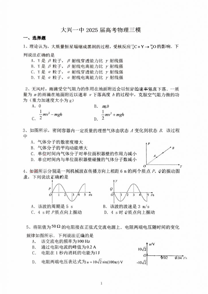 北京部分中学近期陆续进行了高三三模考试,北达高考复读学校整理了大兴一中2025年高三三模物理试题及答案,供考生下载练习。