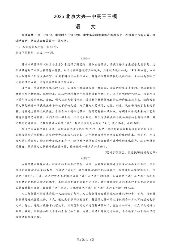 北京部分中学近期陆续进行了高三三模考试,北达高考复读学校整理了2025北京大兴一中高三三语文试题及答案,供考生下载练习。