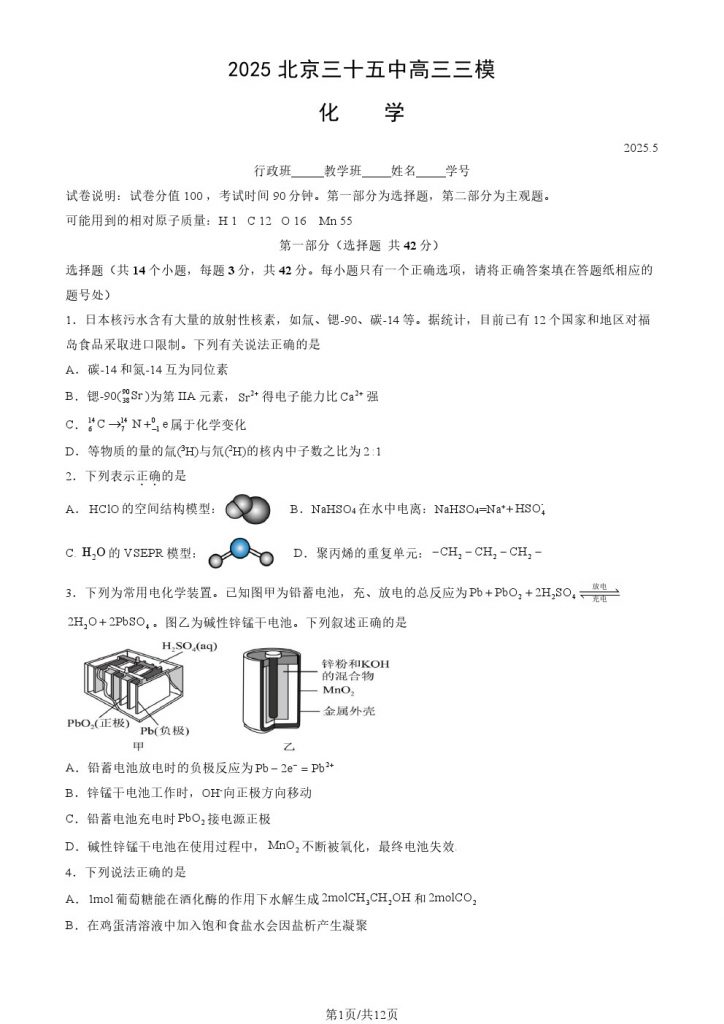 北京部分中学近期陆续进行了高三三模考试,北达高考复读学校整理了北京三十五中2025高三三模化学试题及答案,供考生下载练习。