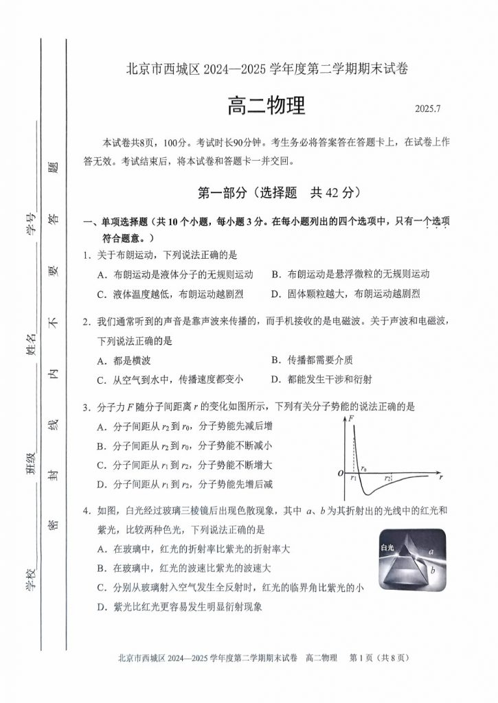 2025年北京各区高二(下)期末考已陆续开始进行,北达教研组整理了2025北京西城区高二(下)期末物理试题及答案,分享给大家。