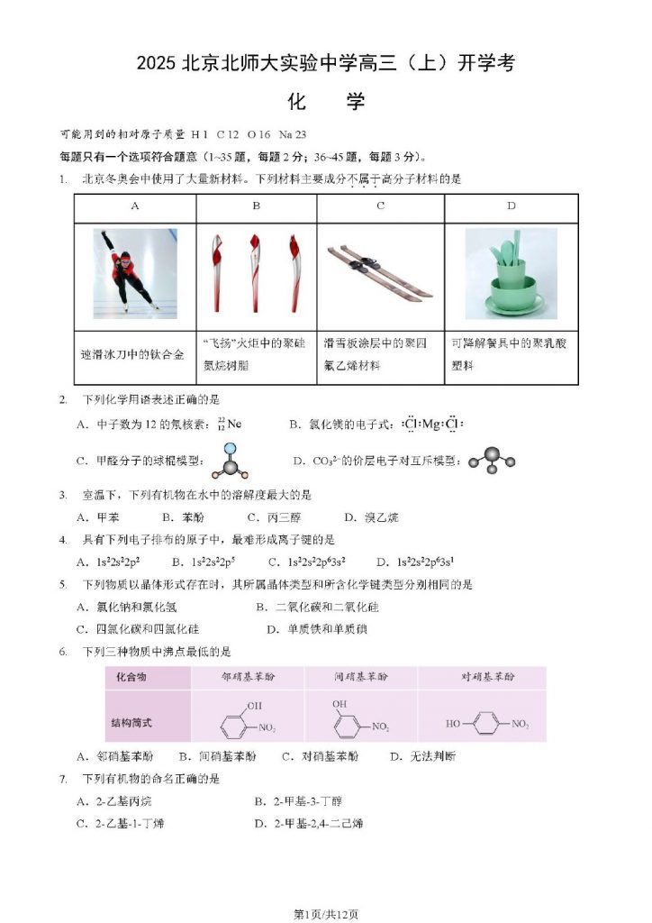 北达教研组整理了2025北师大实验中学高三(上)开学考化学试题及答案,看看都考了哪些内容?