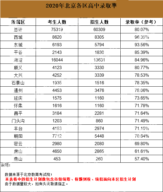 表1为2021年各区高中录取率,招生计划包含市级统筹、校额到校、统招、国际班/校面向本区招生的计划;表2为2020年各区高中录取比例,招生计划为市级统筹、校额到校、统招面向本区招生计划。
