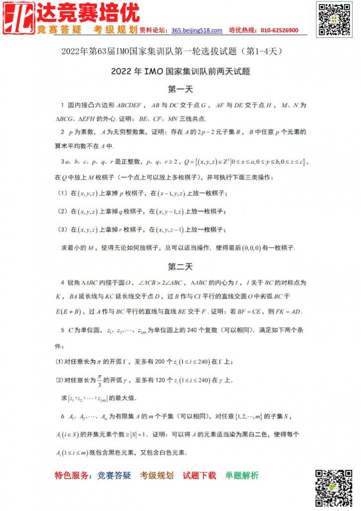 2022第63届IMO国际数学奥赛国家集训队第一轮选拔试题(第1-4天)。北达中考复读学校教研组收集整理,分享给大家。