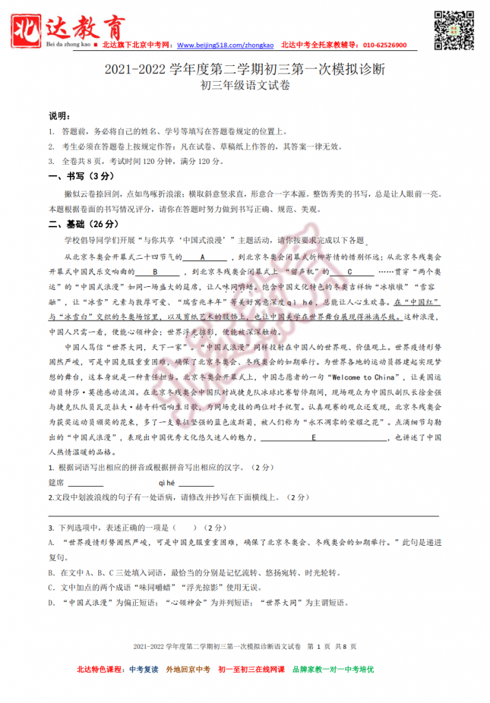深圳2022年初三第一次模拟诊断联考真题(含答案)。北达中考复读学校教研组收集整理,分享给大家。