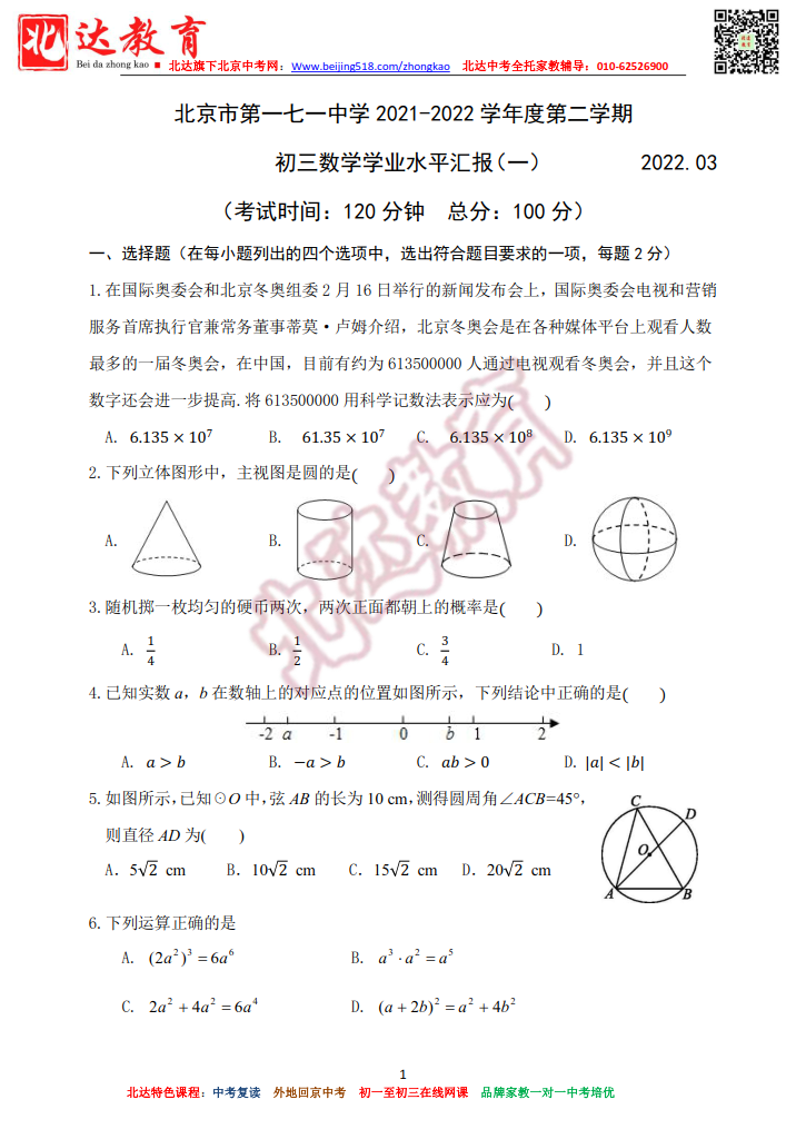 北京市171中学2022年初三下数学学业水平汇报试卷(一)。北达中考复读学校教研组收集整理,分享给大家。