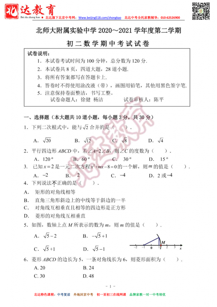 北师大附实验2021初二下期中数学试题含标答。北达中考复读学校教研组收集整理,分享给大家。