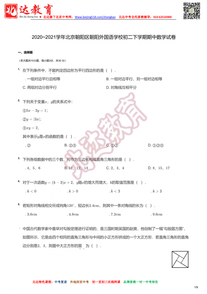 北京朝阳外国语学校2021初二下期中数学试卷及答案。北达中考复读学校教研组收集整理,分享给大家。