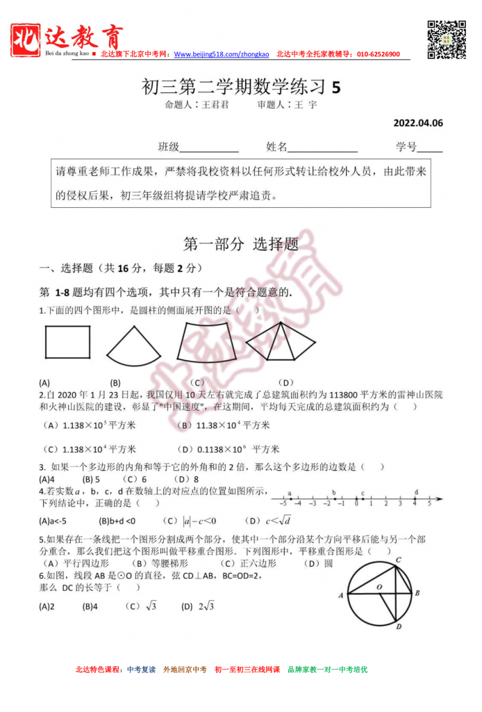 人大附中分校202204初三下数学练习5。北达中考复读学校教研组收集整理,分享给大家。