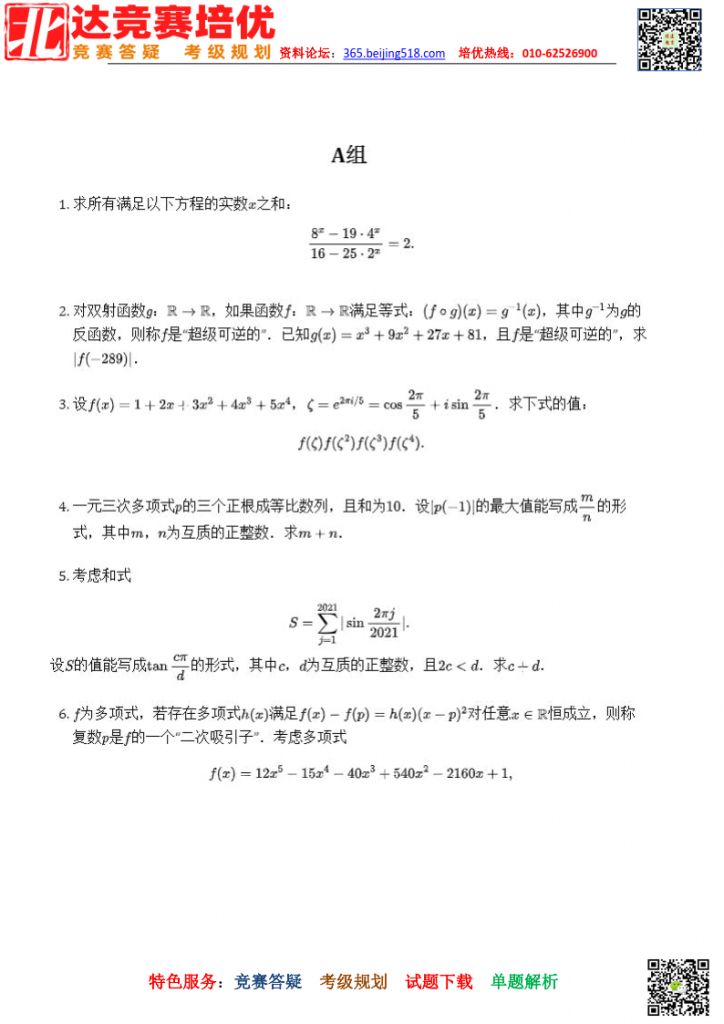 2021年普林斯顿数学竞赛代数组(中文版)。北达中考复读学校教研组收集整理,分享给大家。