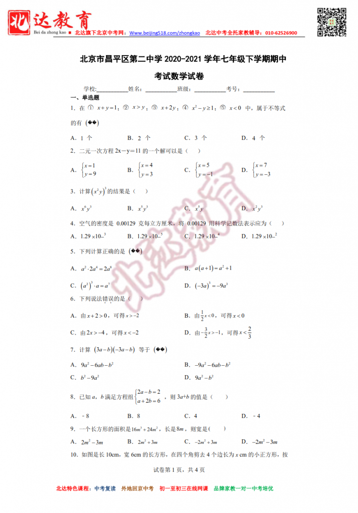 北京昌平二中2021初一下期中数学试题及答案。北达中考复读学校教研组收集整理,分享给大家。