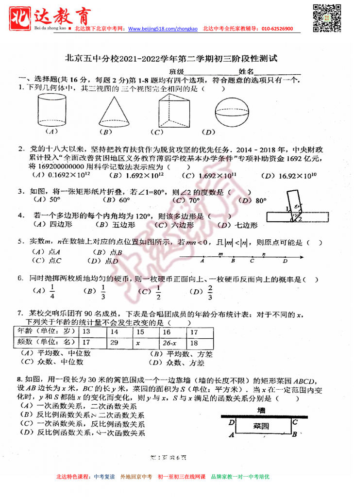北京五中分校2022初三零模数学试卷。北达中考复读学校教研组收集整理,分享给大家。