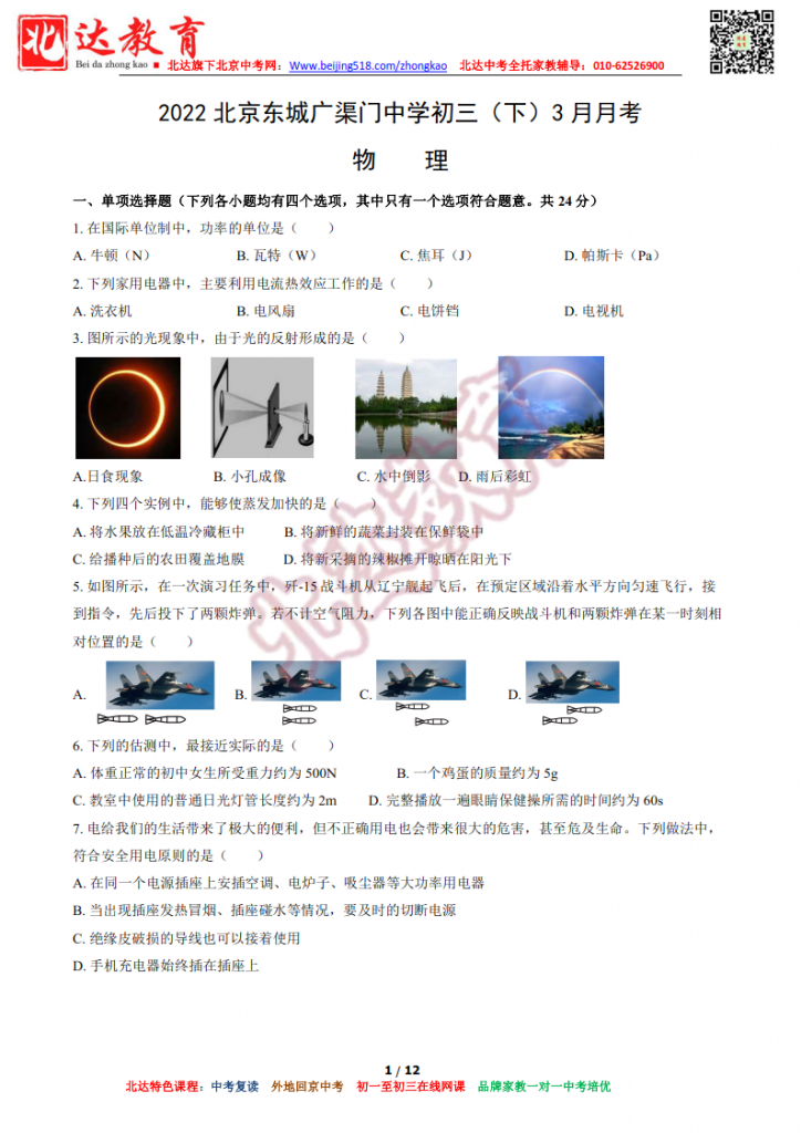 北京广渠门中学2022初三下3月月考物理试题及答案。北达中考复读学校教研组收集整理,分享给大家。