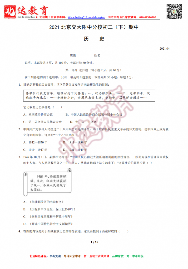 北京交大附中2021初二下期中历史试题及答案。北达中考复读学校教研组收集整理,分享给大家。
