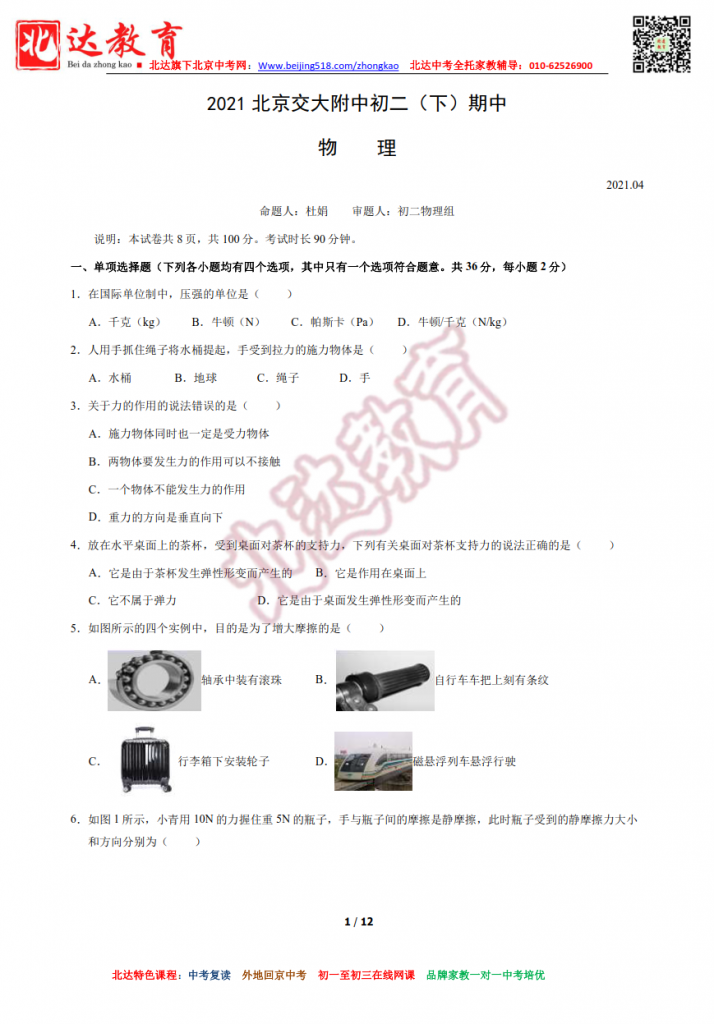 北京交大附中2021初二下期中物理试题及答案。北达中考复读学校教研组收集整理,分享给大家。