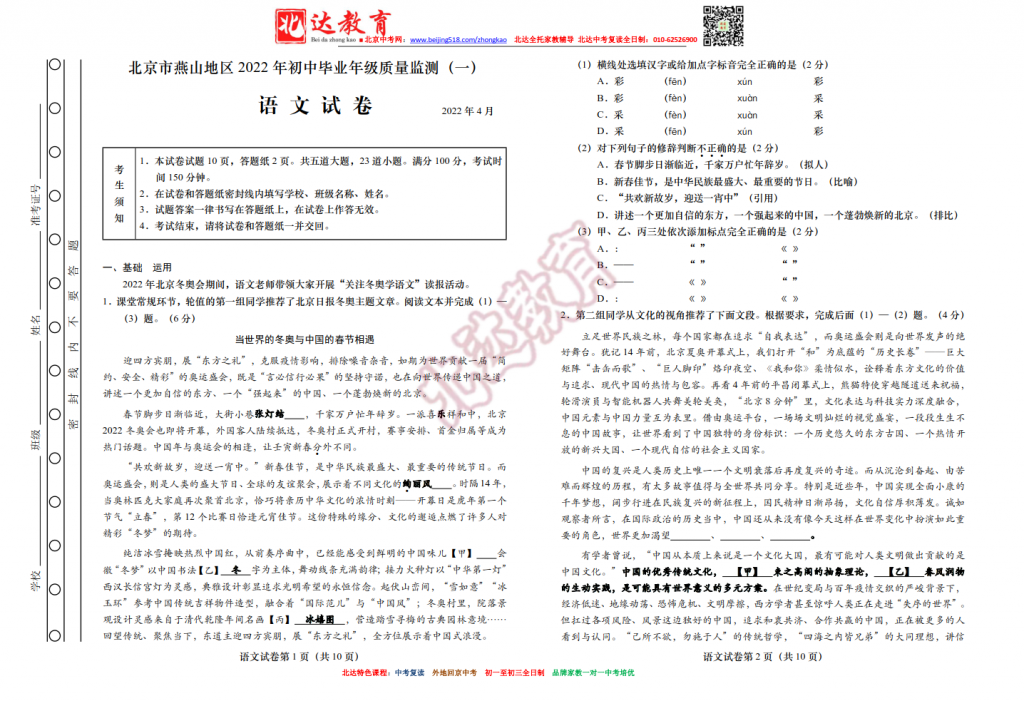 北京燕山2022初三一模语文试题(高清版)。北达中考复读学校教研组收集整理,分享给大家。