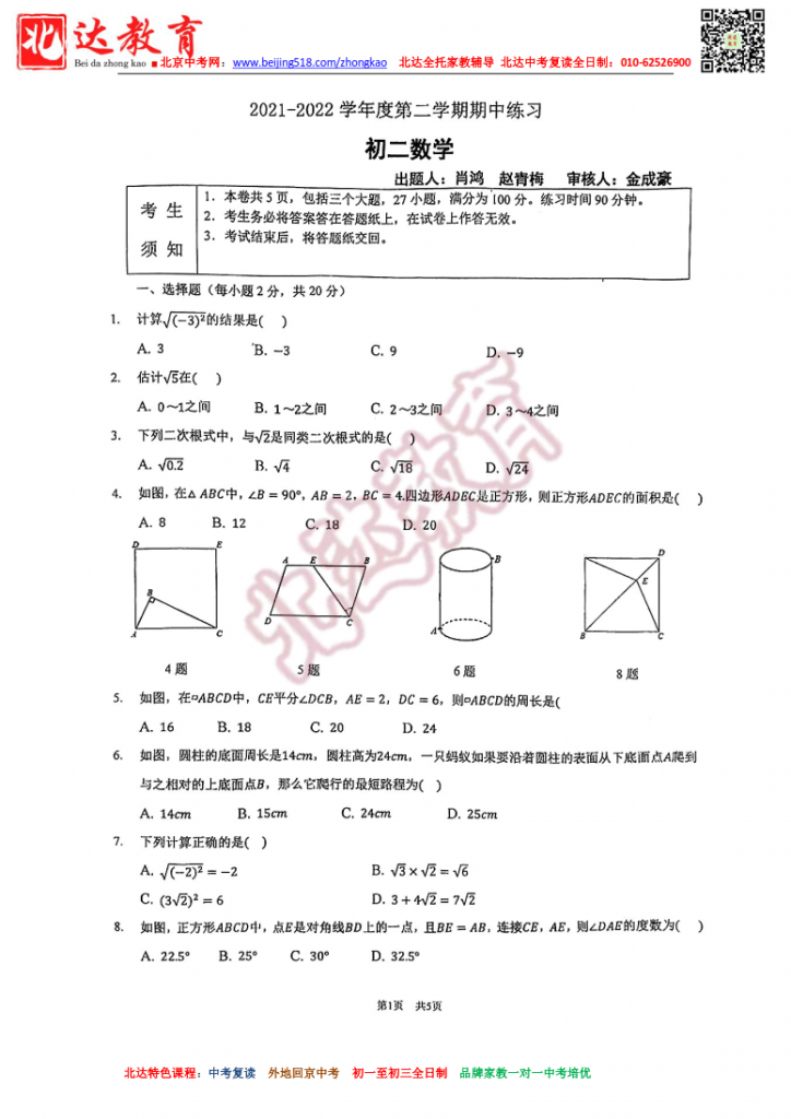 北京海淀教进附属实验学校2022初二下期中数学试卷(高清版)。北达中考复读学校教研组收集整理,分享给大家。