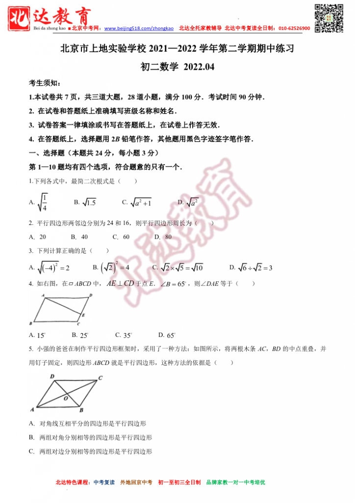 北京上地实验学校2022初二下期中数学试题及答案(高清版)。北达中考复读学校教研组收集整理,分享给大家。
