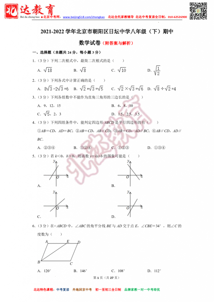 北京日坛中学2022初二下期中数学试题及答案(高清版)。北达中考复读学校教研组收集整理,分享给大家。