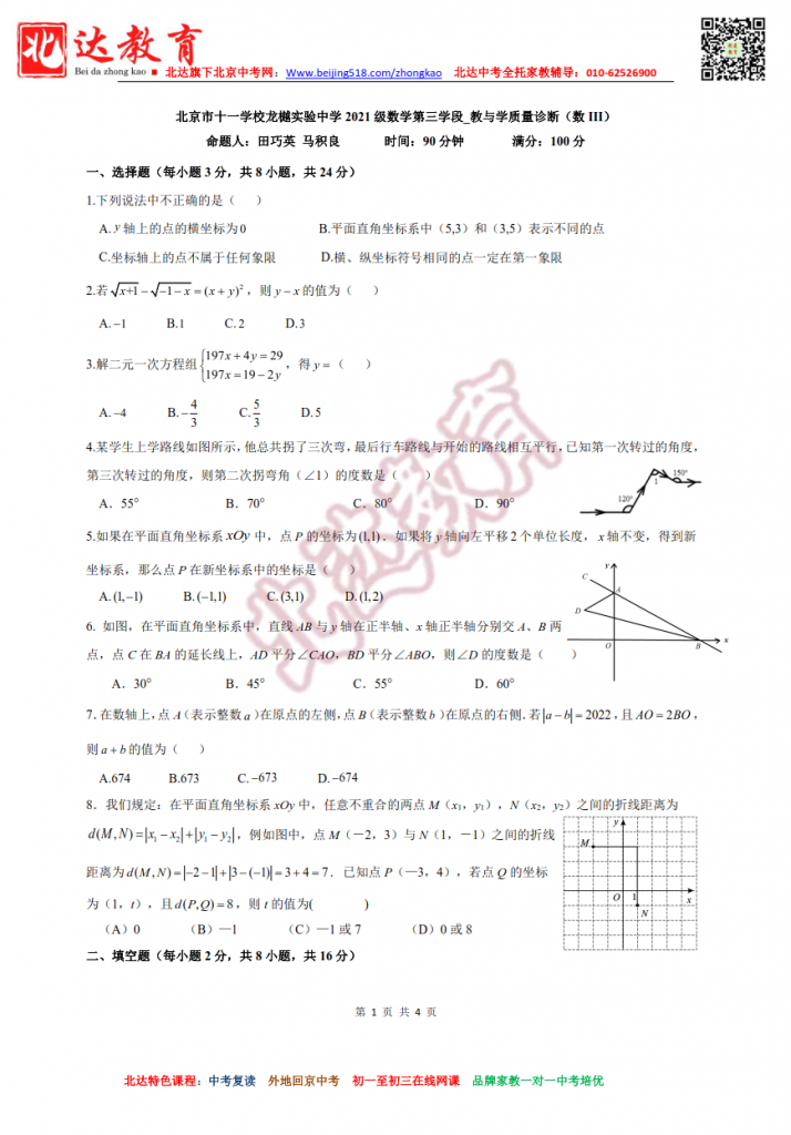 北京十一学校龙樾实验中学2021级数学第三学段教与学质量诊断(数III高清版)。北达中考复读学校教研组收集整理,分享给大家。