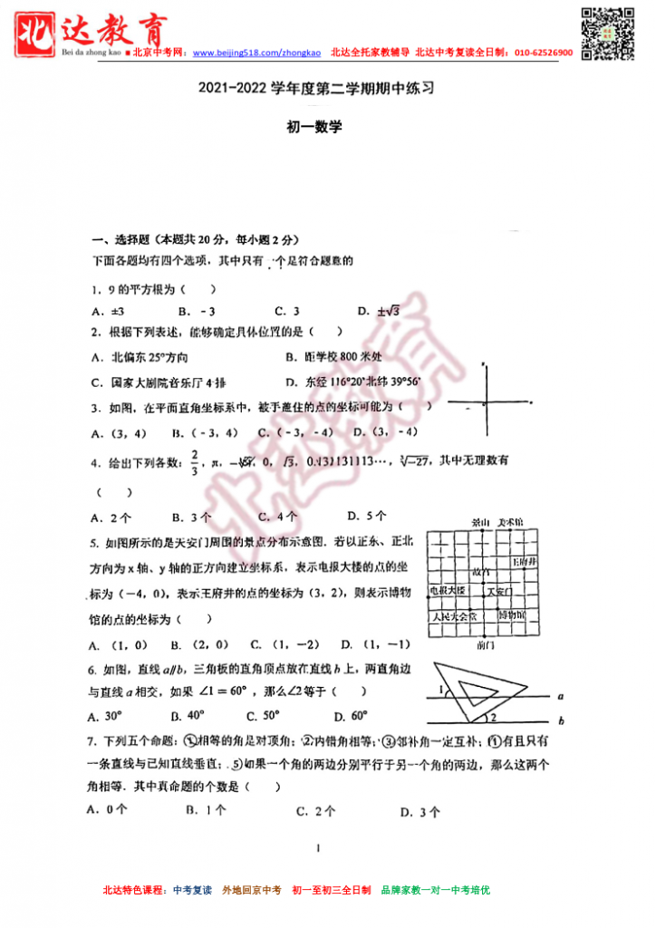 北大附中实验学校22022初一下期中数学试卷(图片版)。北达中考复读学校教研组收集整理,分享给大家。