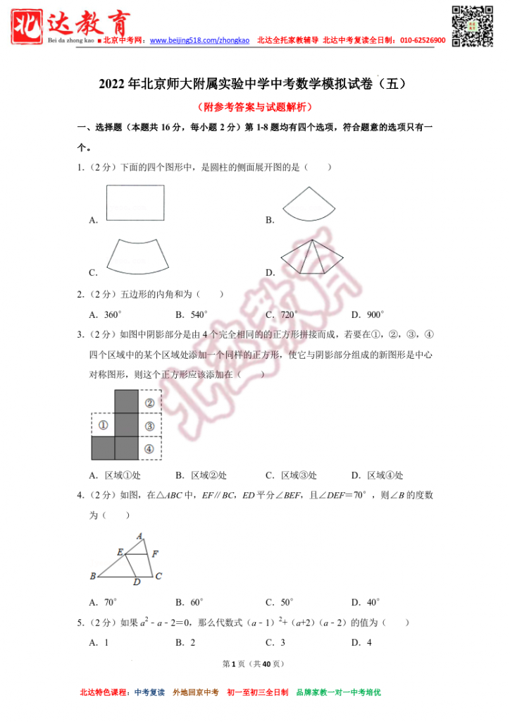 北师大附实验中学2022初三一模数学试卷及答案(高清版)。北达中考复读学校教研组收集整理,分享给大家。