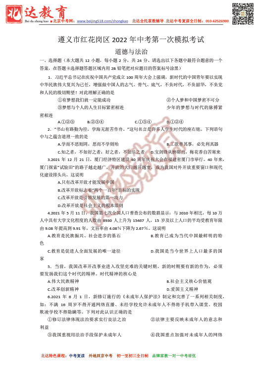 2022年贵州中考一模道德与法治试题及解析汇总。北达教研组收集整理,分享给大家。