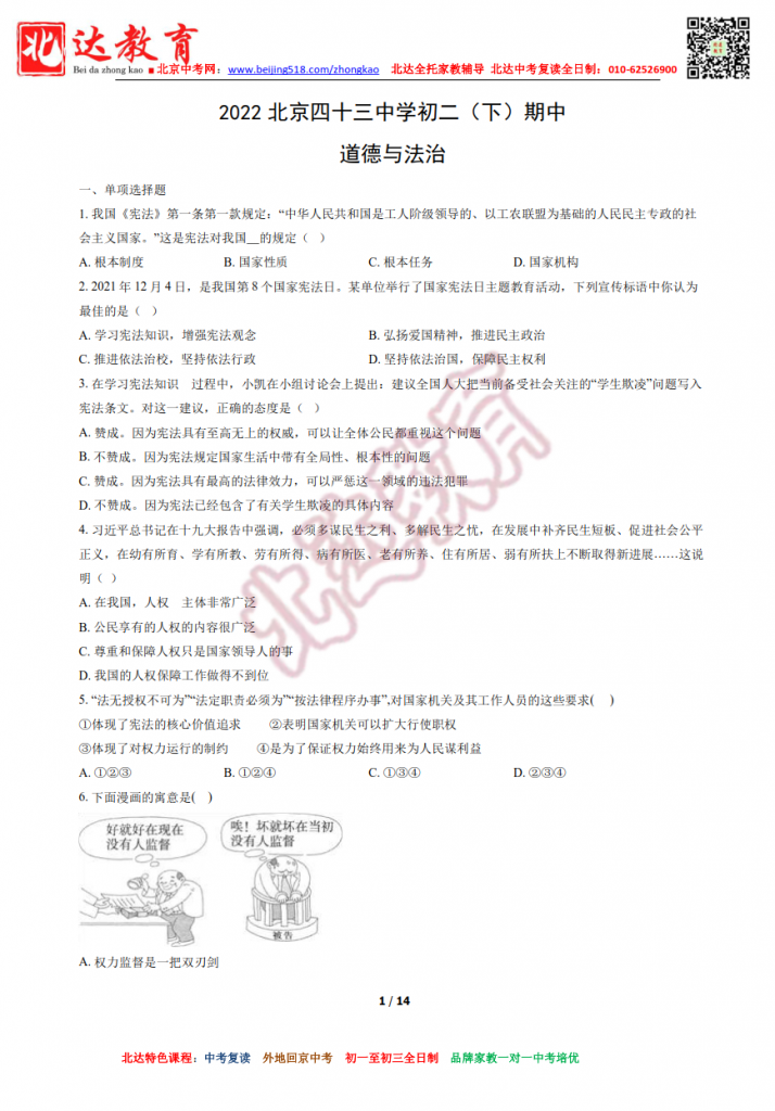 北京四十三中2022初二下道法试题及答案(高清版)。北达中考复读学校教研组收集整理,分享给大家。