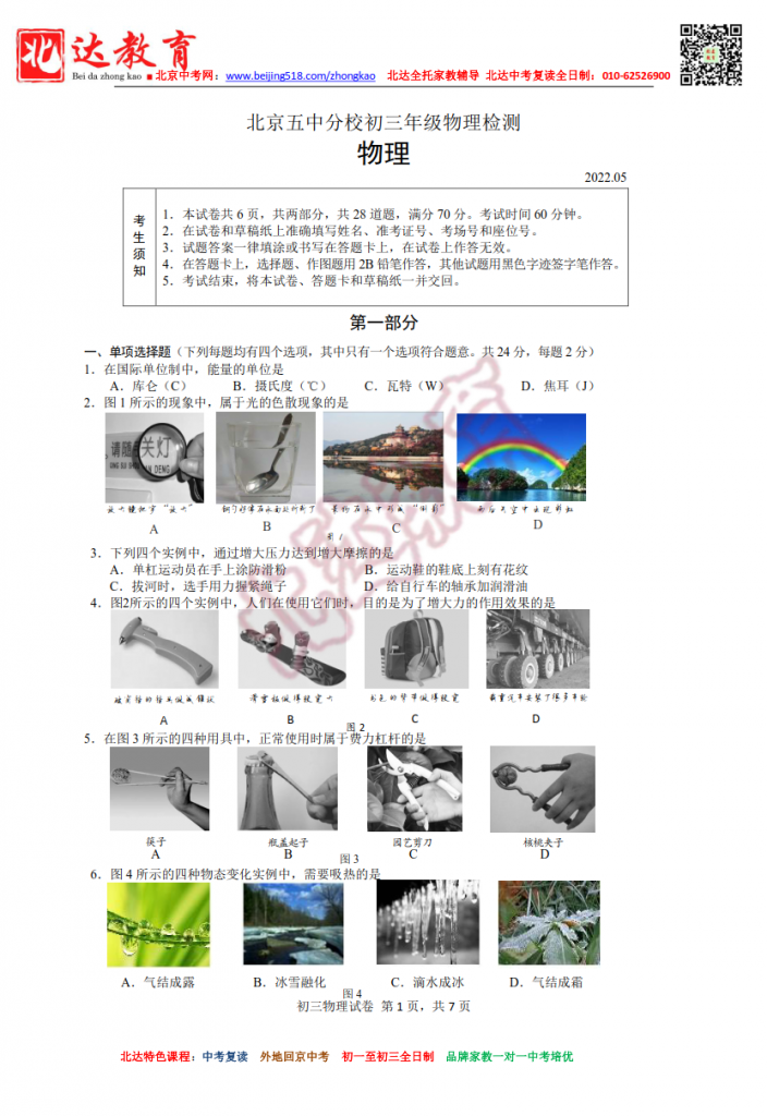 北京五中分校2022初三下物理检测(高清版)。北达中考复读学校教研组收集整理,分享给大家。