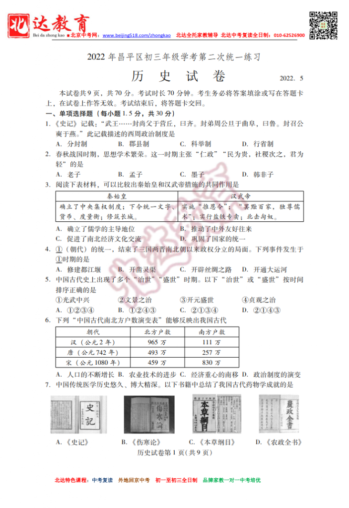 北京昌平2022初三二模历史试题(高清版)!北达中考复读学校教研组收集整理,分享给大家。