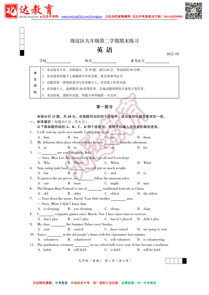 北京海淀2022初三二模英语试题及答案(高清版)!北达中考复读学校教研组收集整理,分享给大家。