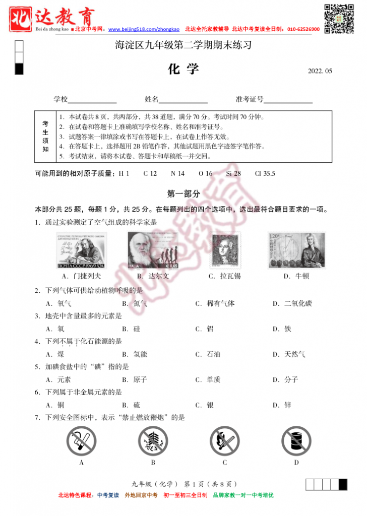 北京海淀2022初三二模化学试题(高清版)!北达中考复读学校教研组收集整理,分享给大家。