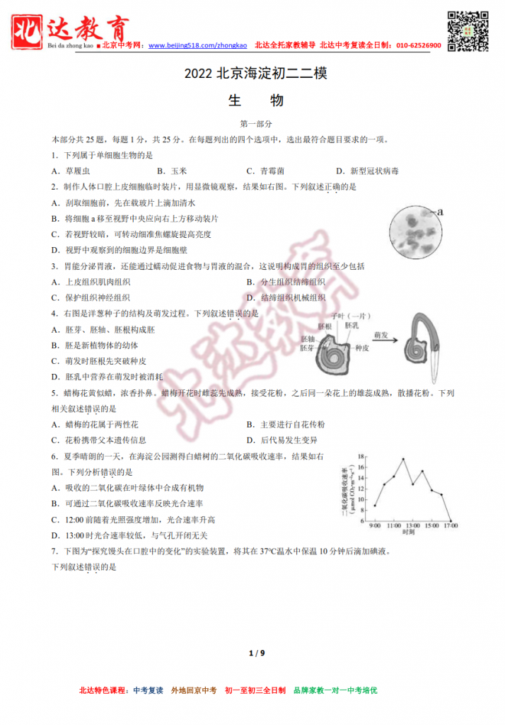 北京海淀2022初二二模生物试题及答案(高清版)!北达中考复读学校教研组收集整理,分享给大家。