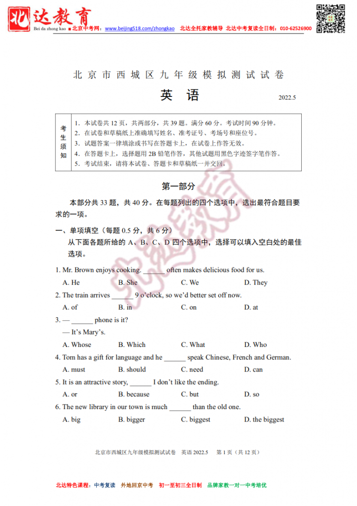 北京西城2022初三二模英语试卷及答案(高清版)!北达中考复读学校教研组收集整理,分享给大家。