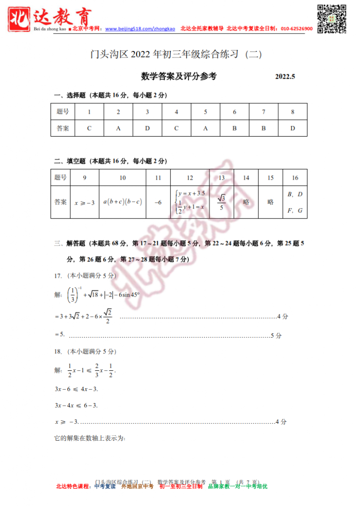 北京门头沟2022初三二模数学答案(高清版)!北达中考复读学校教研组收集整理,分享给大家。