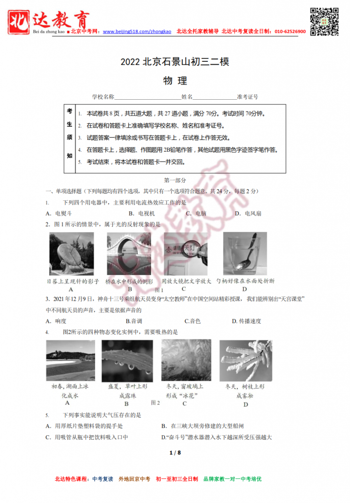 北京石景山2022初三二模物理试卷及答案(高清版)!北达中考复读学校教研组收集整理,分享给大家。