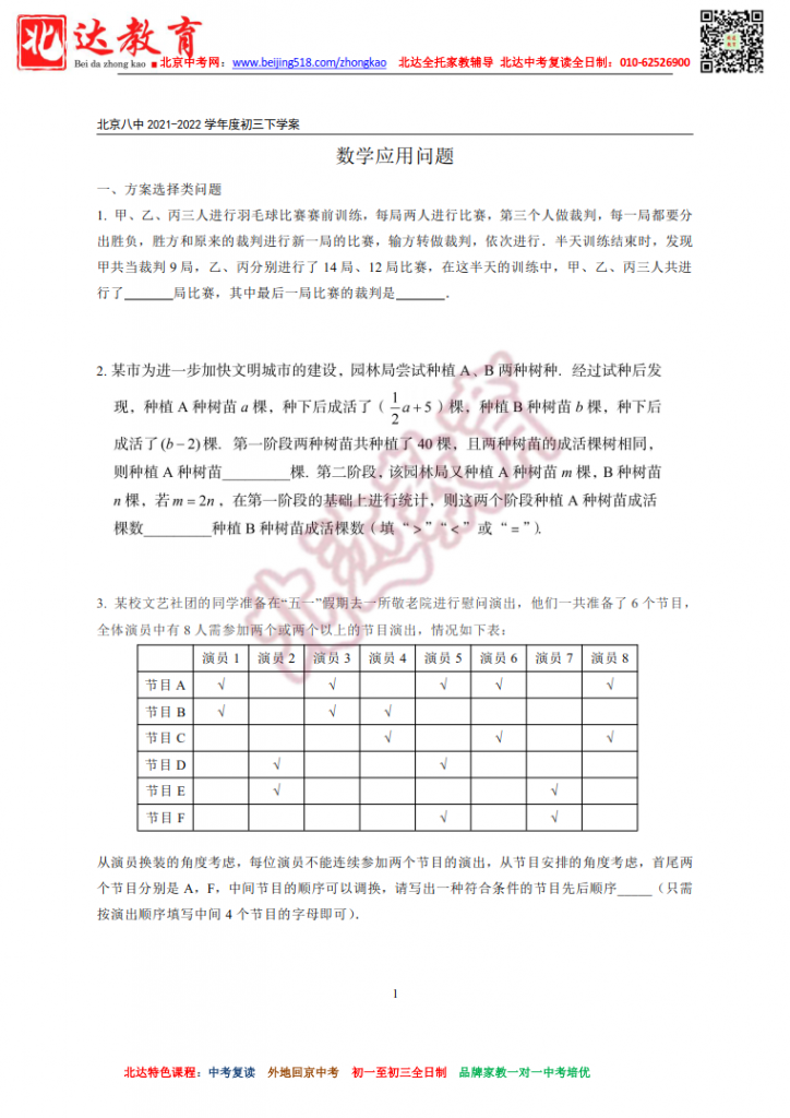 北京八中2022初三下数学应用问题学案(高清版)。北达中考复读学校教研组收集整理,分享给大家。